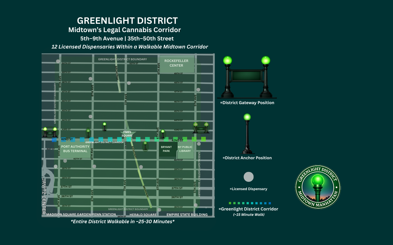 The Greenlight District is a defined area in Midtown Manhattan with one of the highest concentrations of licensed cannabis dispensaries in New York State.